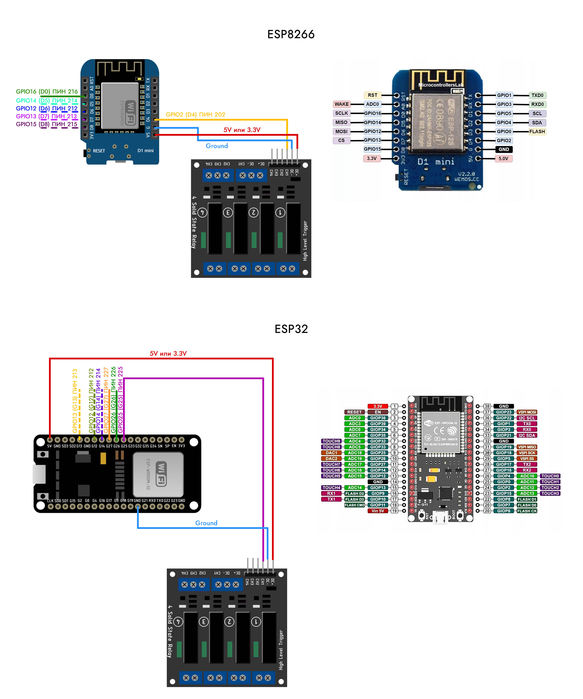 Рассмотрим подключение модуля реле к платам ESP32 и ESP8266 без использования расширителя портов.