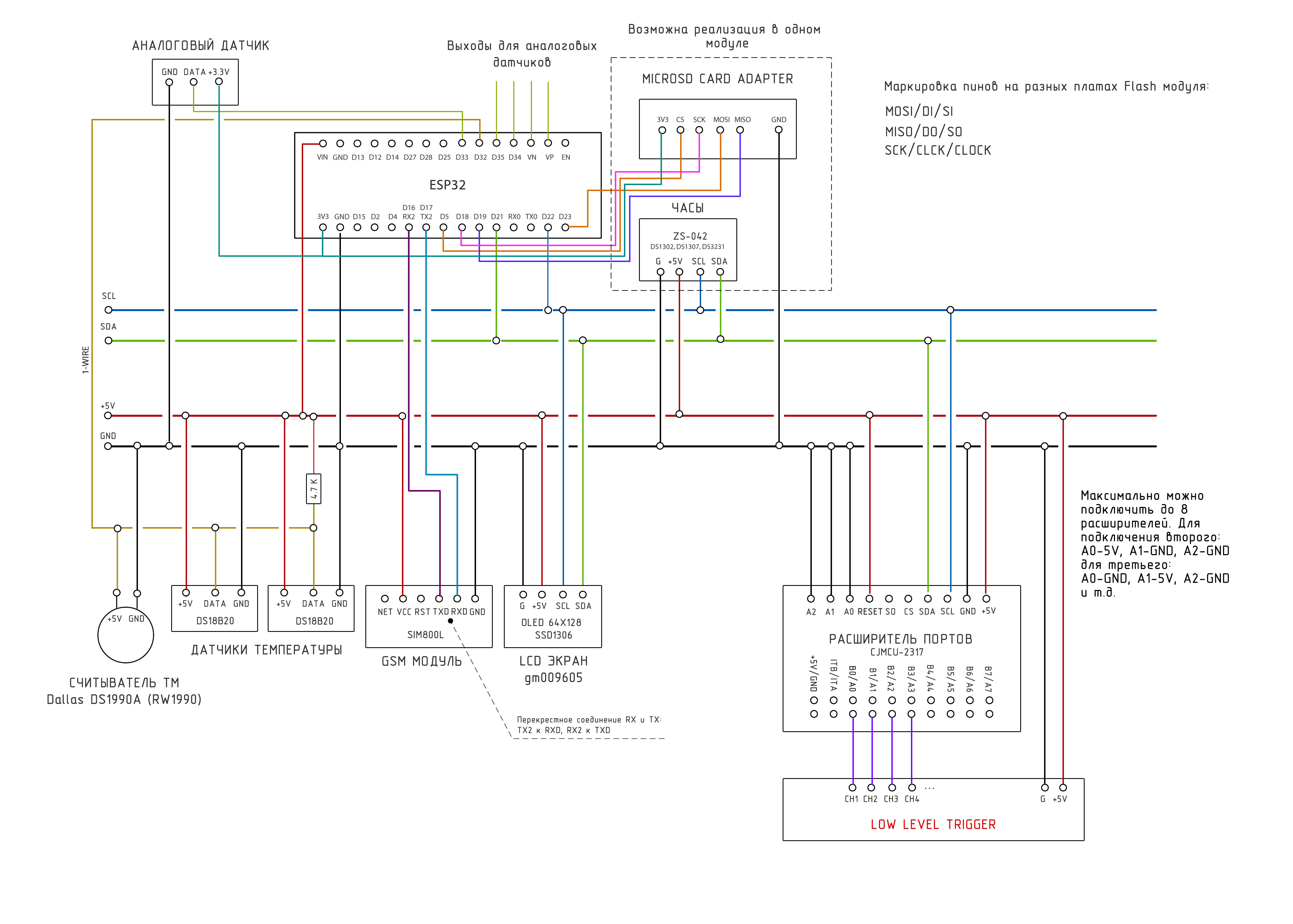 Для работы с устройством необязательно подключать все компоненты, достаточно модуля ESP32, модуля флеш карты MICROSD. Если вы подключите дисплей, то сможете выводить на него информацию о состоянии устройства, реле и датчиков. Подключение остальных компонентов зависит от необходимости и поставленной задачи. Мы подробно описали сборку в нашей статье.
