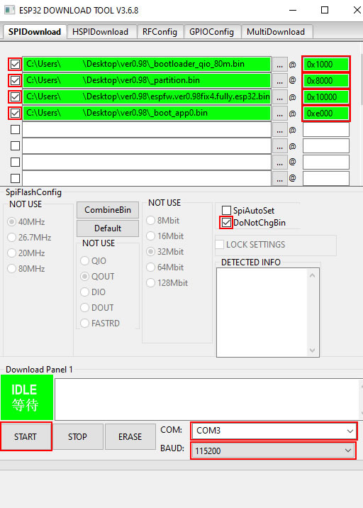 - Внимание! На некоторых модулях ESP32 для заливки прошивки, необходимо нажать кнопку BOOT на самой плате перед нажатием START в Flash Download Tools.