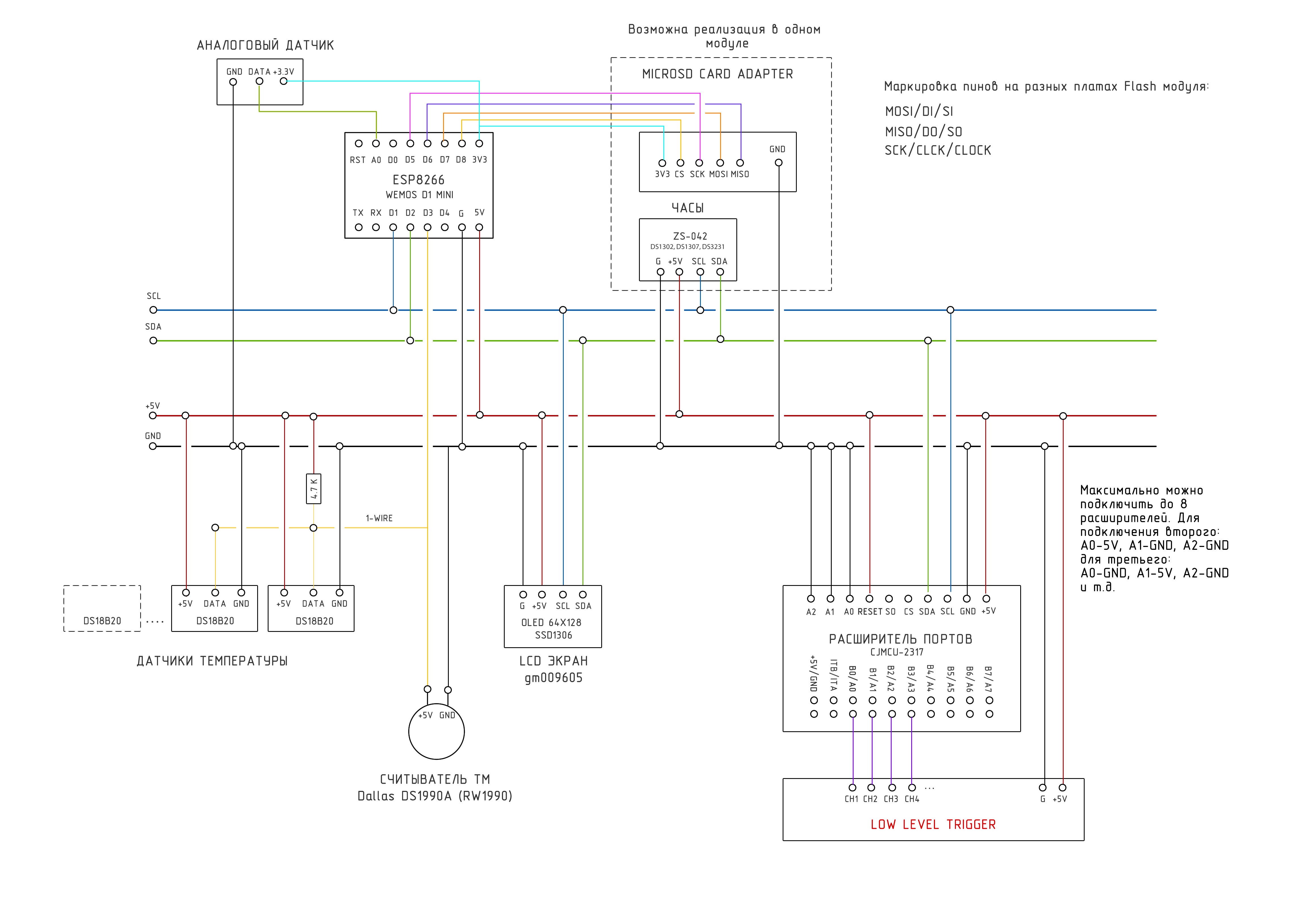 Для работы с устройством необязательно подключать все компоненты, достаточно модуля ESP8266, модуля флеш карты MICROSD. Если вы подключите дисплей, то сможете выводить на него информацию о состоянии устройства, реле и датчиков. Подключение остальных компонентов зависит от необходимости и поставленной задачи. Мы подробно описали сборку в нашей статье.