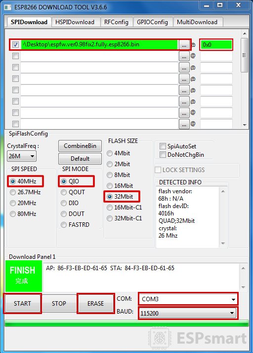 - SPI SPEED устанавливаем 40 MHz, SPI MODE ставим QIO, FLASH SIZE 32Mbit